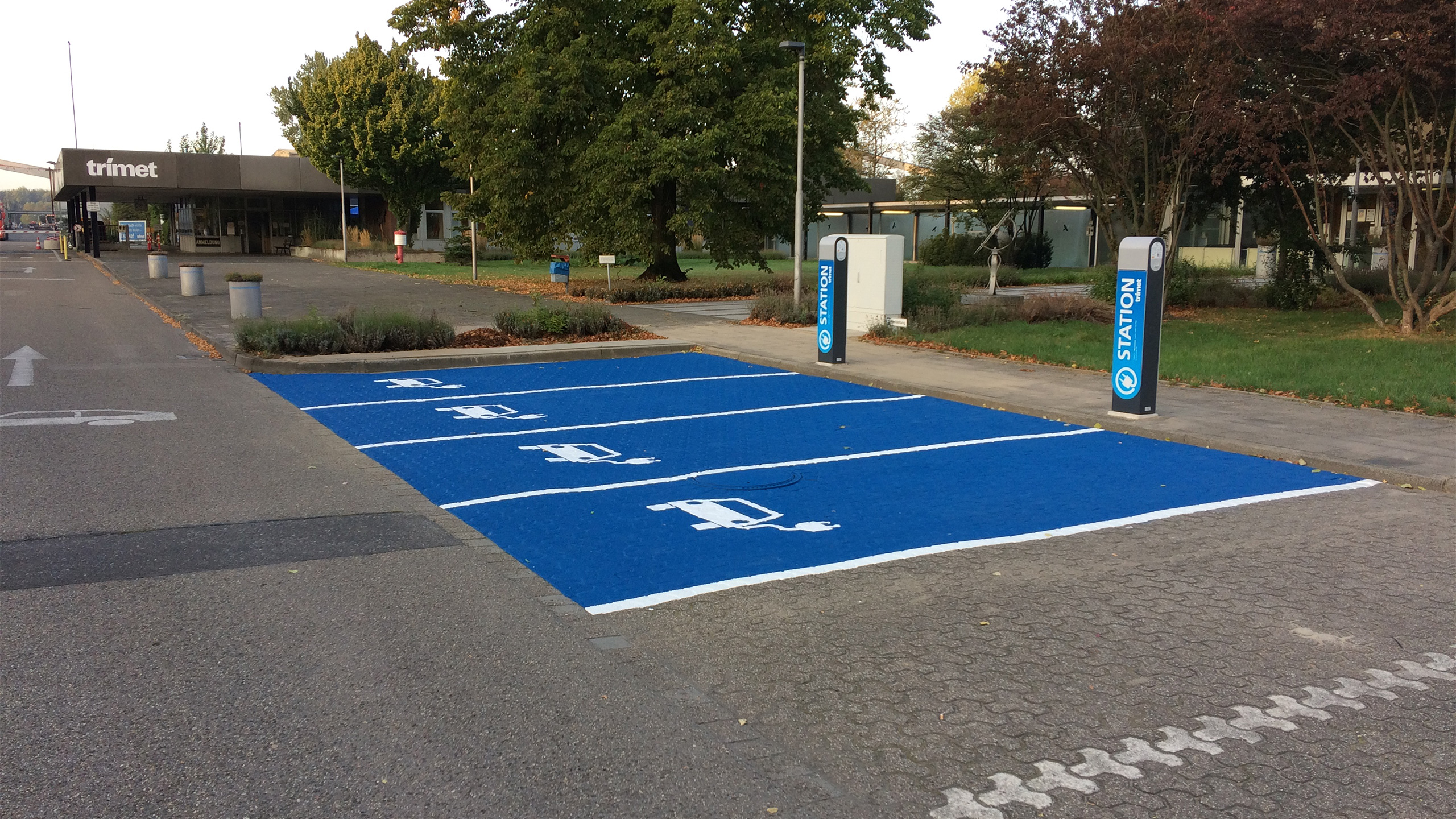 Two charging columns with four charging points are installed on the areas marked in blue, which supply electric motors with "fuel". The decisive factor for the installation was that environmentally friendly driving is on the rise at TRIMET. The number of e-cars in the TRIMET fleet is increasing, and many colleagues regularly commute between the Voerde and Essen sites, where charging stations are already in place.